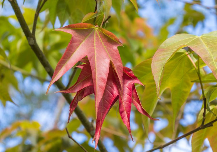 Während der klassische Amberbaum eine ausladende, breitkronige Silhouette entwickelt, bleibt 'Slender Silhouette' mit einer Breite von etwa 1,5 bis maximal 2 Metern extrem kompakt. Gleichzeitig kann er Höhen von bis zu 15 Metern erreichen. Dadurch eignet sich diese Sorte hervorragend für kleine Stadtgärten, schmale Grundstücke, architektonische Pflanzkonzepte oder als vertikaler Akzent in modernen Gartendesigns. Typisch für die Art sind die fünflappigen, ahornähnlichen Blätter, die im Frühjahr frischgrün austreiben und sich im Herbst spektakulär verfärben – in Tönen von Gelb über Orange bis leuchtend Rot und Purpur. Auch die graubraune, längsrissige Rinde mit ihren markanten Korkleisten verleiht dem Baum eine besondere Struktur – selbst im blattlosen Zustand im Winter.