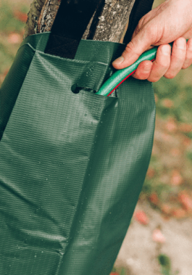 Die grünen Säcke sind zudem  mit Leichtigkeit um den Baum gelegt und mit einem leichtgängigen Reißverschluss befestigt. Bei Bedarf ist es sogar möglich den Sack mit einer Diebstahl-Schutzvorrichtung zu sichern.